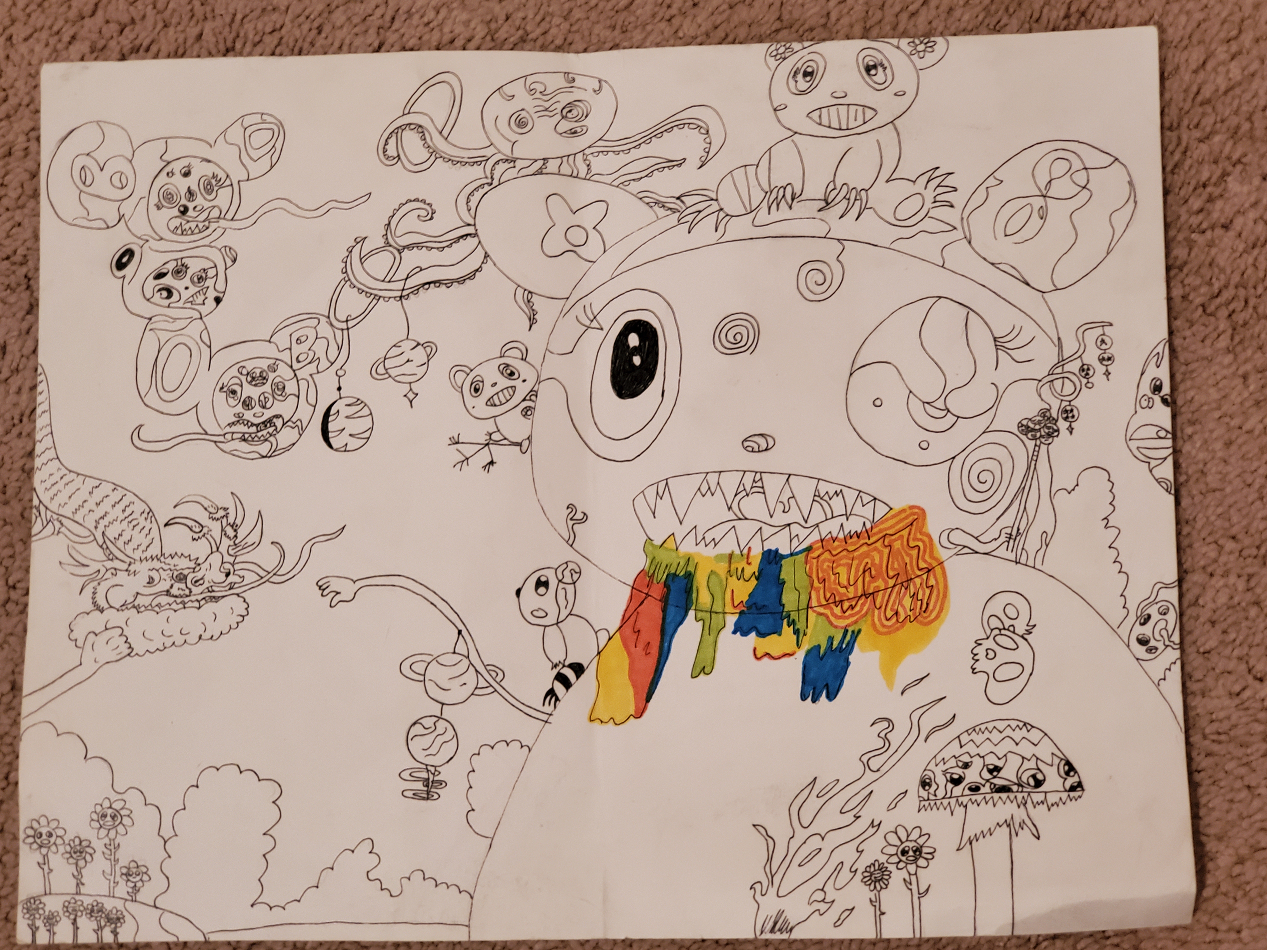 The idea behind this project if I recall correctly was attention, how I can catch the audience's attention right off the back. Using ink and a different shade of ink to create more detail in the design. Afterward using different colors towards the center of all characters to create them apart from the other character. Creating this attention towards the artwork.