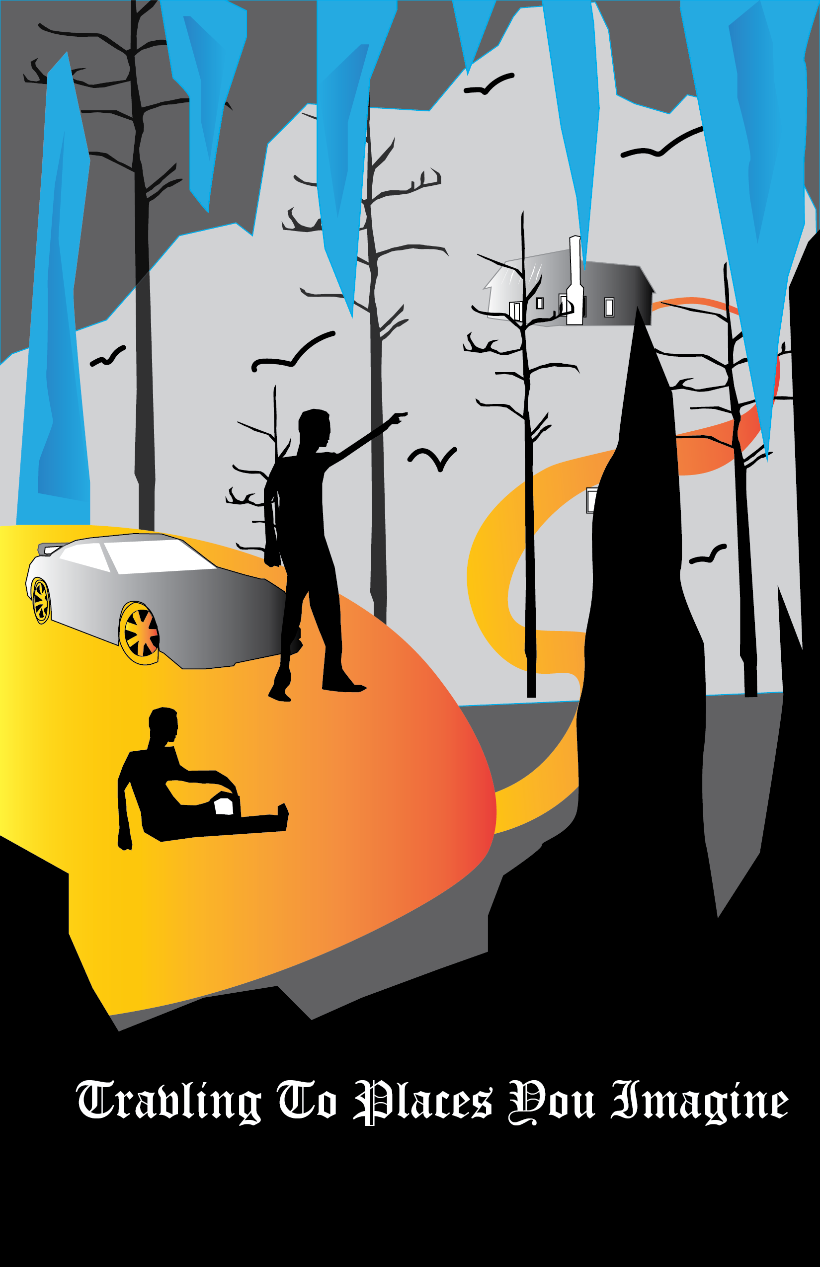 The theme behind this poster design is traveling, traveling to a fictional place. It can be a golden road to bright but instead, it leads towards a creepy house, same with the setting of the poster in a cave with ice but at the same time with rocks that are not frozen.