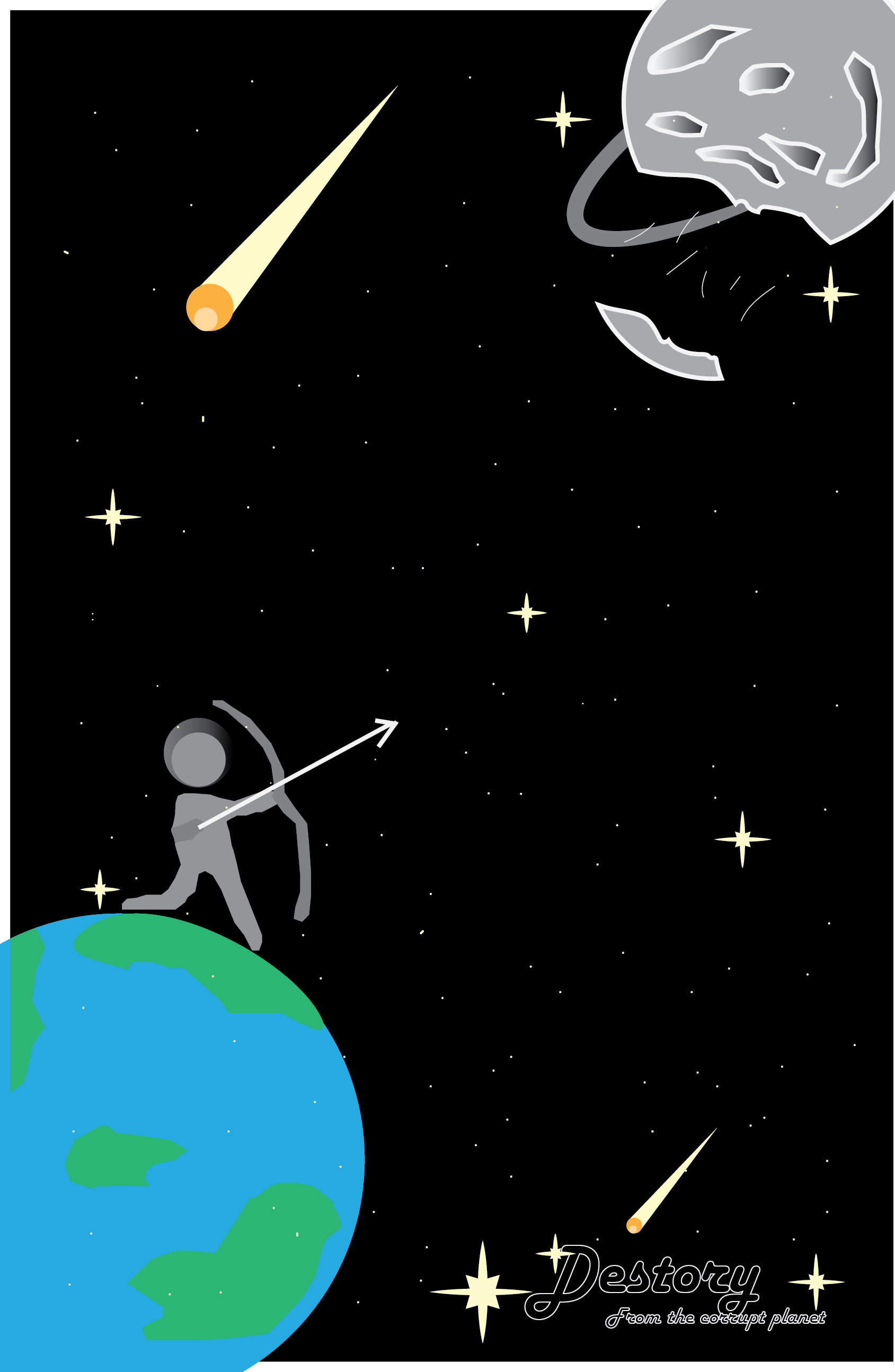 Taking JPL poster designs as an inspiration to create a poster. The story behind is a planet falling apart and the pieces are falling towards earth creating disaster and the astronaut's job is to take a bow and shot down the falling pieces from the corrupted planet.
