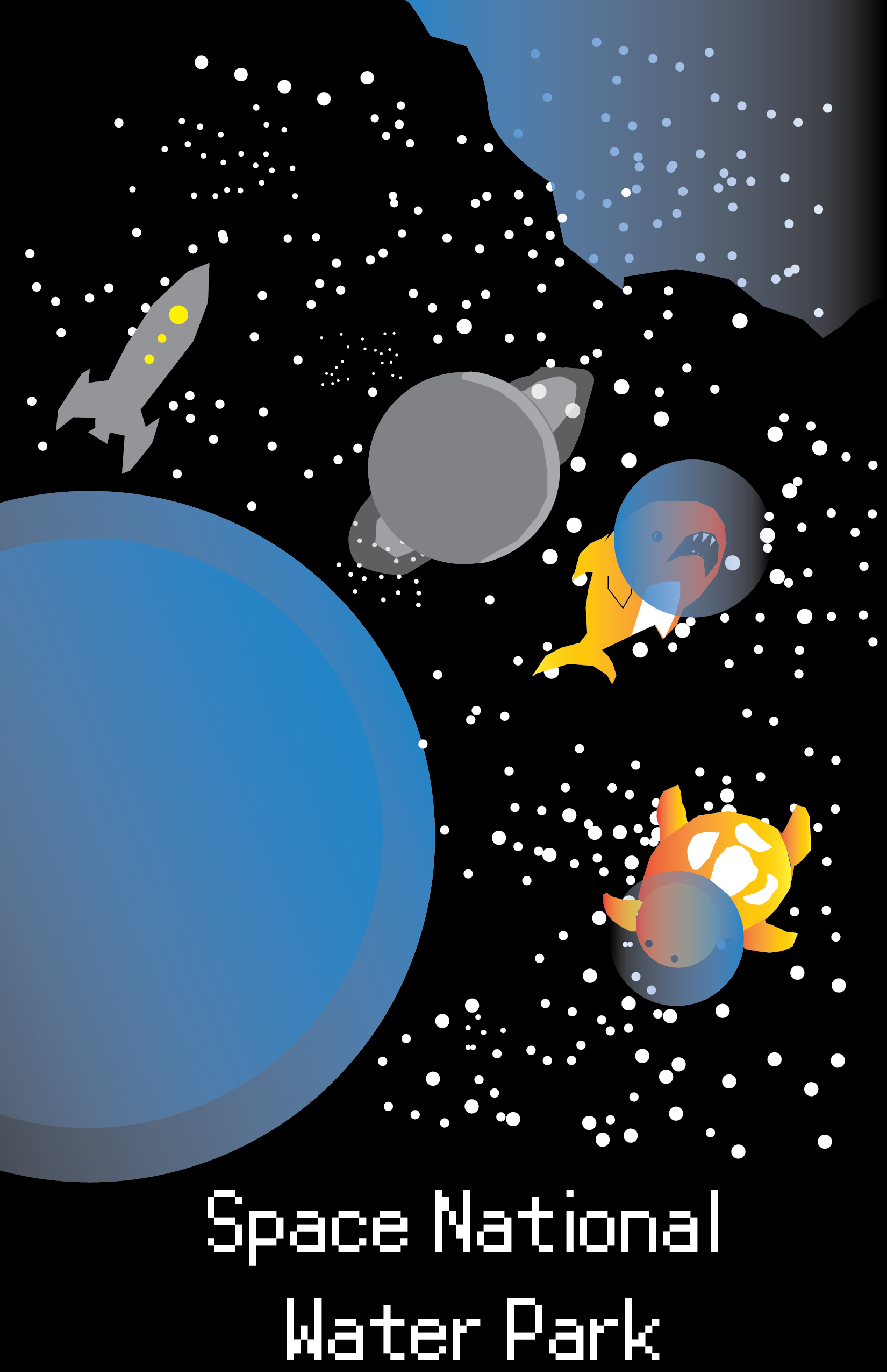 Have you ever vision what a park would look like in space? For this poster design, I create a vision that I have towards what I think a space national park would look like in space. For me water parks are more similar to space with zero gravity and are hard to control, this is why there are only water creatures in this poster.